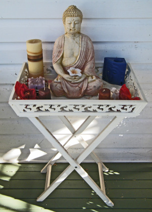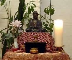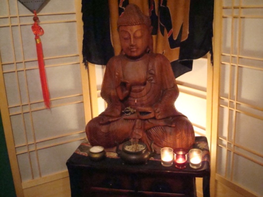 We recommend that your altar consist minimally of three tea candles to represent the Three Jewels, an incense burner, and a representation of an Universal expression. The Universal expression is where your creative imagination comes into play. Most often it is a statue of Buddha. For Christians it might be a cross or image of Christ. Other beliefs have their own sacred elements. It does not need to be Buddhist as we honor all Interfaith traditions. But this type of element is not necessary either. Other iconographic images can replace the central focus element. From a Buddhist perspective it can be an eight-spoke Dharma Wheel, an image of the mudra hand, a specific image of a column, a throne, flowers – especially the lotus, something like a fan with the Heart Sutra printed on it, maybe a rock or other natural element even. Perhaps a nice scroll or print on the wall behind your altar is something that you already have that you enjoy. Some altars have a ‘minimalist’ look with the candles, an incense bowl and a few flowers. Unlike the Tibetan or Pure Land Buddhist schools, it is not necessary to face your altar in a specific direction or level of the house. A basement space is fine, and often preferred. Don’t think your altar must be like what you see in temples and practice centers. A home altar should reflect your own needs for achieving a bodymind state of peace and contentment.
