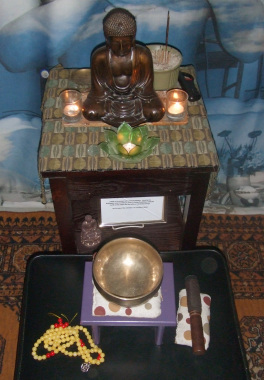 As mentioned, it is not necessary that the space be permanently set-up. You might keep your supplies in a container and the cushions stored in a closet or under a bed, for example. You can also acquire a wall altar that has doors that shut when not in use. This is an excellent alternative for small spaces. Many altars have been set-up on a bookshelf, and the meditation cushions brought out during practice time. So be creative. But the one basic requirement is that the space be consistent. As we train the mind to be quiet, having a familiar space helps.